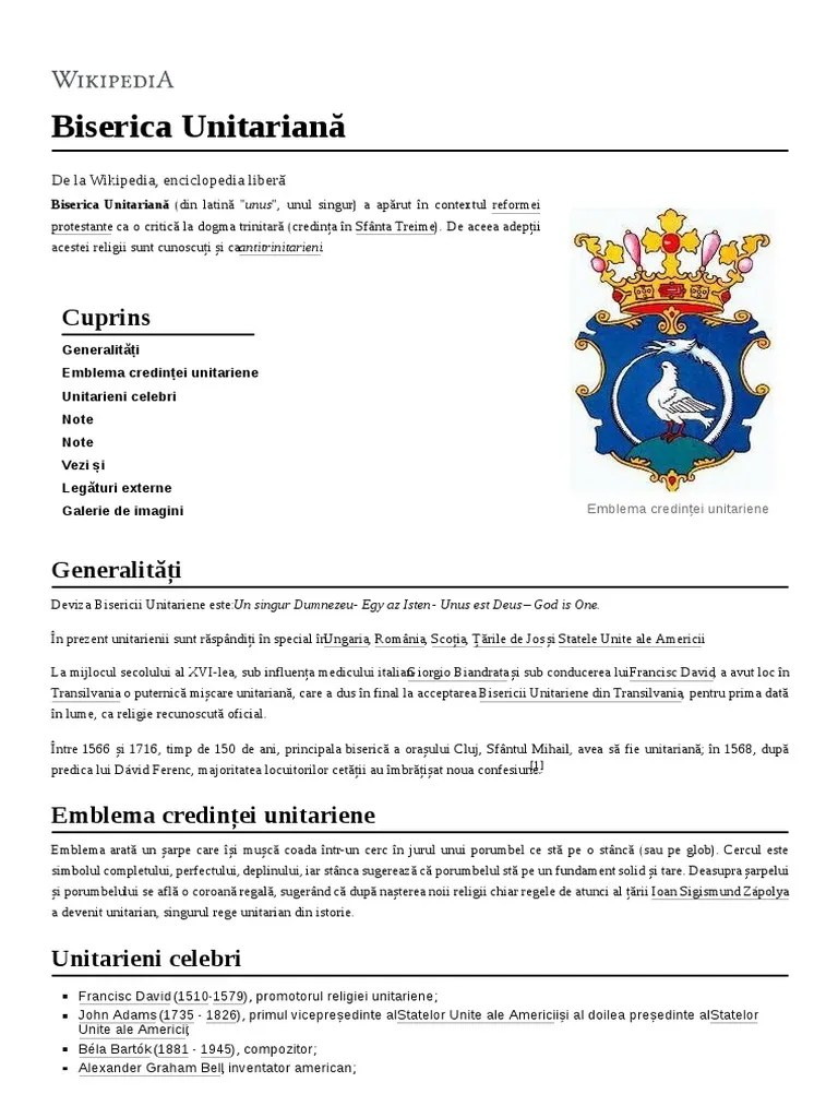 Identitatea unitariana este puternica din toate punctele de vedere, si noutatile care au aparut in viata si exprimarea ei, bazata pe aceasta. Comunitatea unitariană a folosit până în 1716 biserica din piața centrală a orașului (sf. Iisus a fost un om deosebit, dar om; Se bănuiește că religia wicca a luat naștere (cu aproximație) la începutul secolului trecut, „inventatorul" acesteia fiind gerald gardner,. 10.09.2014 · din anul 1565 a început reformaţia unitariană, proclamând ca dumnezeu este unul singur, şi că fiecare om este liber să aleagă religia după propria credinţă. Acest eveniment a fost legat de numele regelui ioan sigismund (primul principe al transilvaniei, apoi rege al ungariei) si.