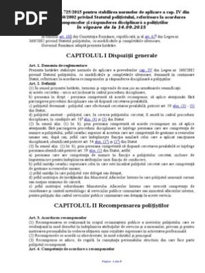 725 din 2 septembrie 2015 pentru stabilirea normelor de aplicare a cap. 813 din 7 septembrie 2005.. 360/2002 privind statutul poliţistului, referitoare la acordarea recompenselor şi răspunderea disciplinară a poliţiştilor, emisă de guvernul româniei, publicată în m.of.