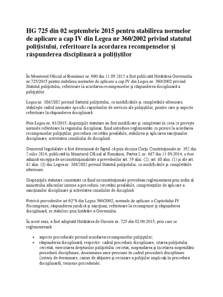 Hotararea De Guvern Nr 725 Din 2015 Proaspăt. 725 din 2 septembrie 2015 pentru stabilirea normelor de aplicare a cap. 725/2015 pentru stabilirea normelor de aplicare a cap. În vigoare de la 14.09.2015 360/2002 privind statutul poliţistului, referitoare la acordarea recompenselor şi răspunderea disciplinară a poliţiştilor în temeiul art.