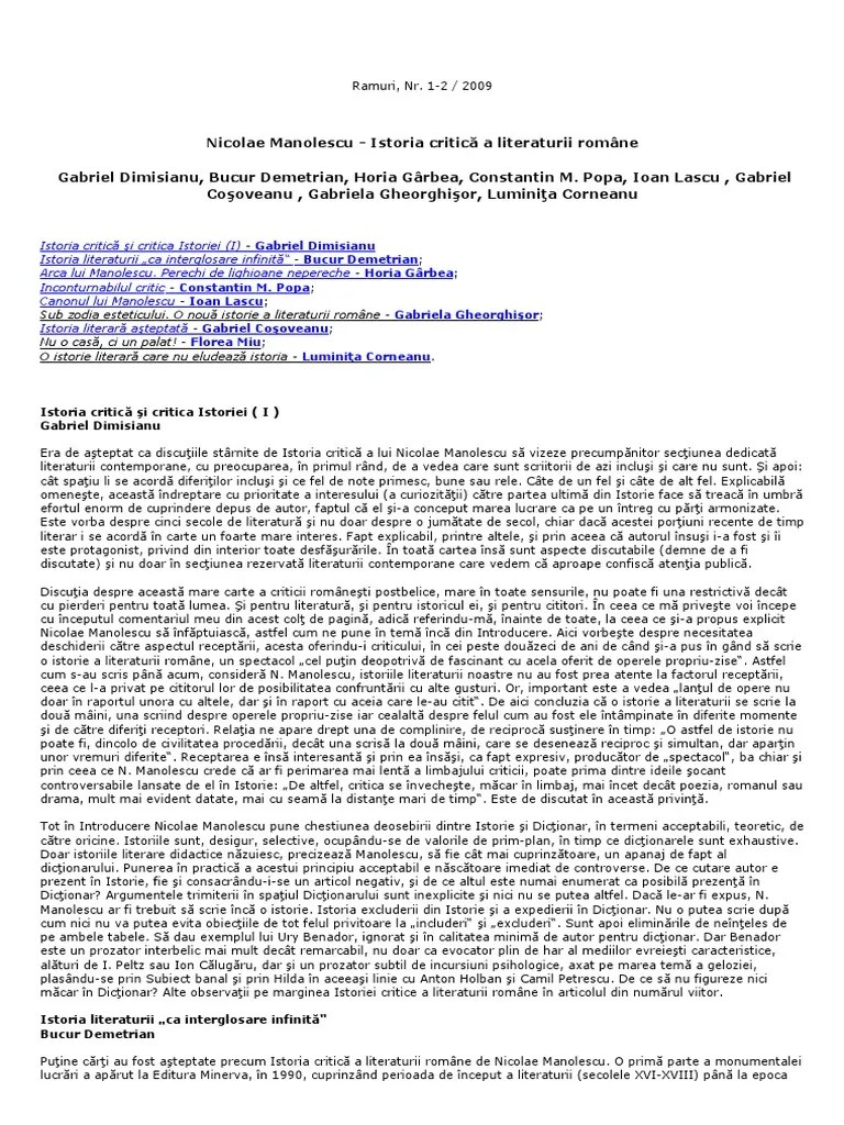 E article draws upon a general view of ….. E article draws upon a general view of … Cartea are 1504 de pagini și se încadrează în categoria litere critica literara. Nu uebuie si ne inducd in eroare felul flostru de a vedea lucrudle. Cartea are 368 de pagini și se încadrează în categoria litere critica literara. Istoria literaturii romane de la origini pana in. Istoria critica a literaturii romane by nicolae manolescu, , available at book depository with free delivery worldwide.. Nicolae manolescu istoria critica a literaturii romane pdf download nicolae manolescu istoria critica a literaturii romane, nicolae manolescu istoria critica a.