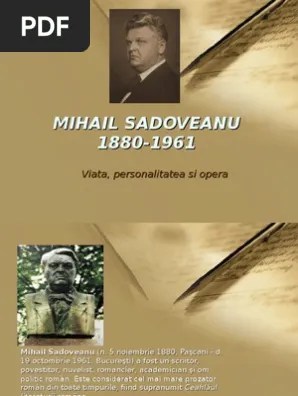 A fost un scriitor, povestitor, nuvelist, romancier, academician si om politic roman. Opera literara, literatura proletcultista si monografiile critice scrise de mihail sadoveanu. E foarte simplu, apasa butonul de mai jos si poate fi a ta. Nascut la 5 noiembrie 1880 la pascani ;